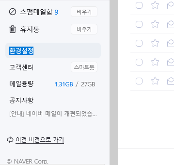 우선 네이버 메일에 로그인 하신 후 좌측 하단에 있는 환경설정을 클릭합니다(아래 이미지).