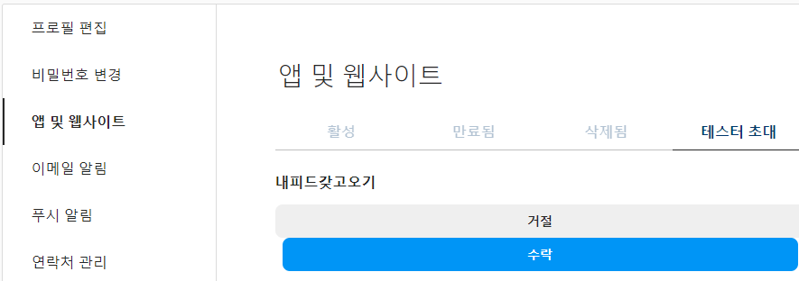 테스터 초대 탭으로 가니 내피드갖고오기 이름으로 떠있습니다. 수락을 클릭하면 됩니다.