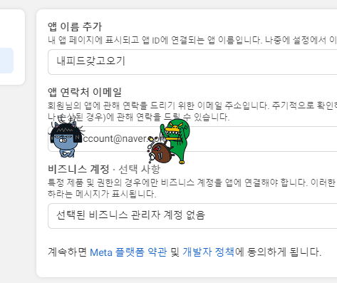 앱 이름, 앱 연락처 이메일, 비즈니스 계정/선택 사항은 알아서 입력하시면 됩니다. 그런 후 앱 만들기를 클릭하세요.