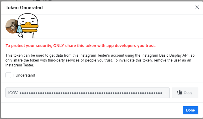 I Understand를 체크하면 아래 Copy 버튼도 활성화되고 자신의 토큰을 복사할 수 있습니다.