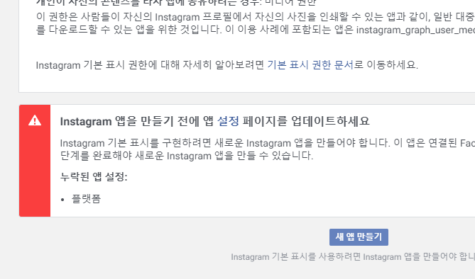 이런 페이지가 나온다면 위에 빨갛게 된 부분에 누락된 게 있다고 하니 저 부분을 입력하면 됩니다. Instagram 앱을 만들기 전에 앱 설정 페이지를 업데이트하세요라는 문장에서 설정에 마우스 올리면 링크가 있습니다. 클릭해서 이동하세요.