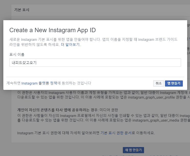 이제 좌측 메뉴에서 Instagram Basic Display, 기본 표시를 클릭합니다.