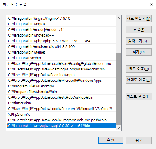 4. 찾아보기(B)... 클릭해서 위처럼 mysql/bin 경로를 추가해 주시면 됩니다. 프로그램을 종료 후 다시 확인해 보시면 됩니다.