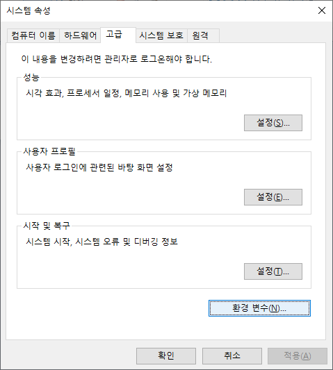 2. 위 이미지에 있는 환경 변수(N)... 부분을 클릭합니다.
