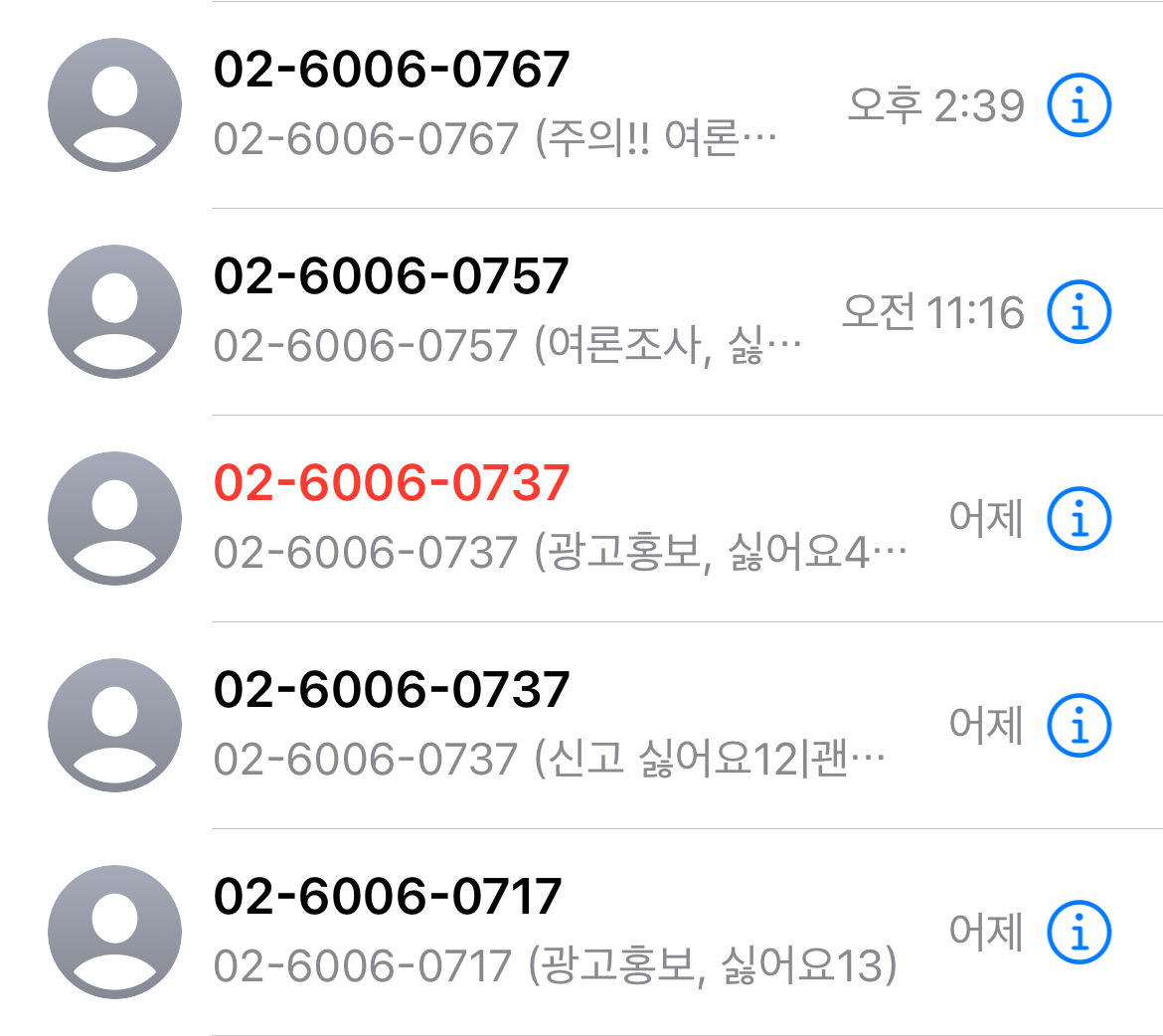 여론조사라고 전화가 미친 듯이 옵니다. 이게 어제랑 오늘 온 것들입니다. 하나 차단하니 번호 바꿔서 또 옵니다.