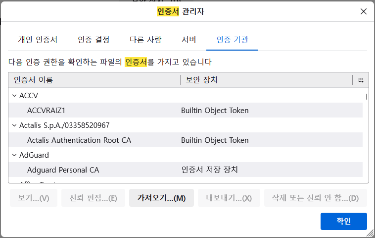 인증서 관리자가 뜨면 하단에서 가져오기...(M) 버튼을 클릭합니다.