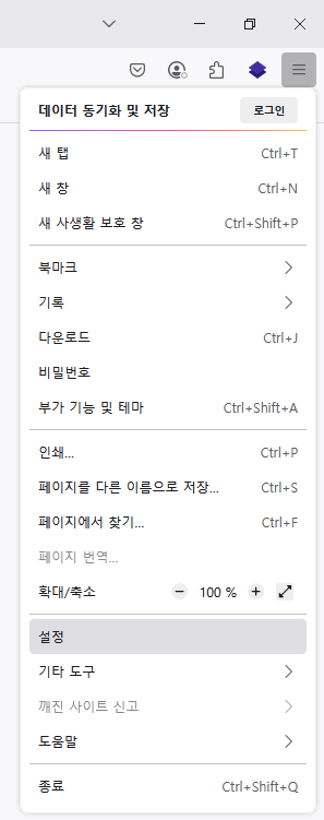 우선 브라우저 우측 상단에 있는 햄버거 메뉴를 클릭해서 설정으로 들어가세요.