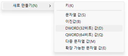 위 위치로 가서 빈 공간에서 마우스 오른쪽 버튼 - 새로 만들기(N) - DWORD(32비트) 값(D) 순서대로 클릭합니다.