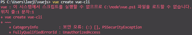 VS Code에 내장된 터미널에서 vue create '프로젝트명' 명령어를 쳤을 때 위처럼 오류가 뜨면