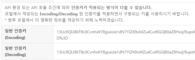 신청하고 나면 위처럼 인증키를 주는데요, 저 같은 경우는 인코딩이 된 인증키가 먹히더라구요. 인코딩이나 디코딩 둘 중 하나 되는 걸로 하시면 됩니다.