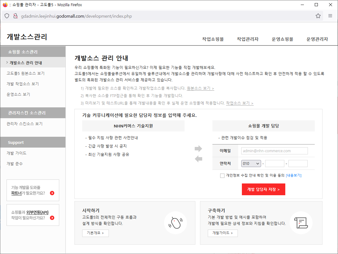 단어만 보면 대충 유추가 가능할 겁니다. 개인적으로 여기서 제일 자주 사용하는 게 작업쇼핑몰 이 메뉴입니다. 다른 건 굳이 클릭할 일이 없더라구요. 개발 작업 단계에서 작업한 걸 위 링크를 클릭하면 볼 수가 있습니다.