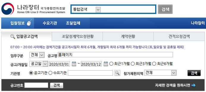 저는 보시듯이 공고명에 '홈페이지'로 검색을 했을 때 나오는 목록을 갖고 오도록 하겠습니다.
