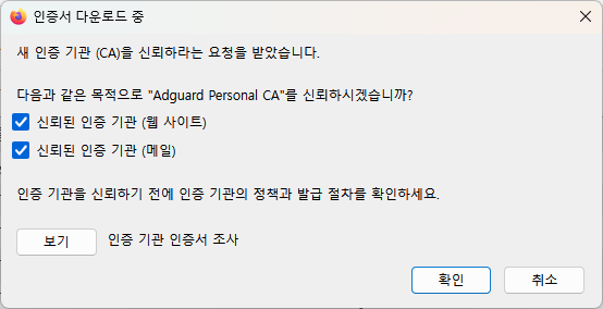인증서 다운로드 중 창이 뜨면 위 체크박스 두 가지를 모두 체크하고 확인을 클릭하시면 됩니다.