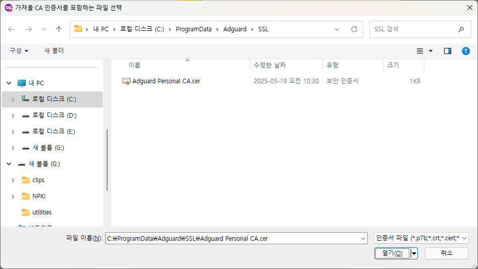 인증서를 선택한 후 열기(O) 버튼을 클릭하시면 됩니다.